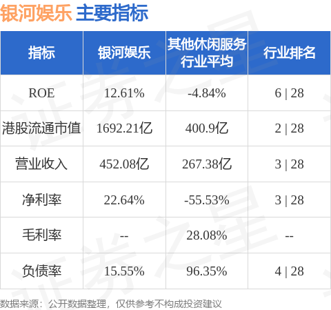 银河娱乐港股市值1692.21亿港元,在其他休闲服务行业中排名第2。主要指标见下表: