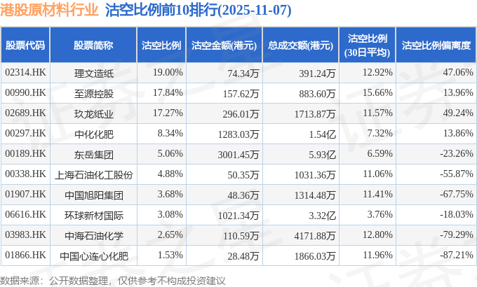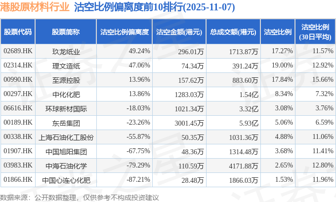 从沽空比例偏离度来看,玖龙纸业、理文造纸、至源控股沽空比例偏离度位居行业前三,分别为49.24%、47.06%、13.96%。