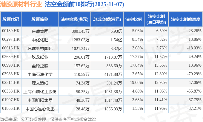 从沽空金额来看,东岳集团、中化化肥、环球新材国际沽空金额位居行业前三,分别为3001.45万港元、1283.03万港元、1021.34万港元。