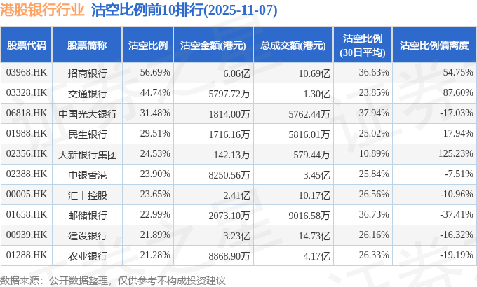 从沽空比例来看,招商银行、交通银行、中国光大银行沽空比例位居行业前三,分别为56.69%、44.74%、31.48%。