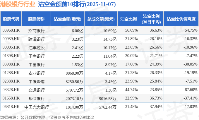 从沽空金额来看,招商银行、建设银行、汇丰控股沽空金额位居行业前三,分别为6.06亿港元、3.23亿港元、2.41亿港元。