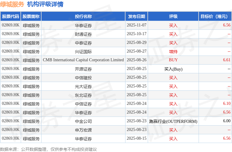 截至2025年11月10日收盘,绿城服务(02869.HK)报收于4.77港元,上涨4.61%,成交量772.4万股,成交额3666.89万港元。投行对该股的评级以买入为主,近90天内共有10家投行给出买入评级,近90天的目标均价为6.4港元。华泰证券最新一份研报给予绿城服务买入评级,目标价6.56港元。