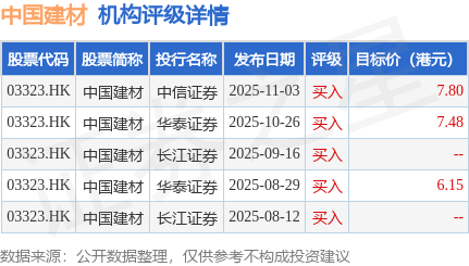 截至2025年11月10日收盘,中国建材(03323.HK)报收于5.5港元,下跌0.72%,成交量1321.01万股,成交额7247.31万港元。投行对该股的评级以买入为主,近90天内共有5家投行给出买入评级,近90天的目标均价为7.14港元。中信证券最新一份研报给予中国建材买入评级,目标价7.8港元。