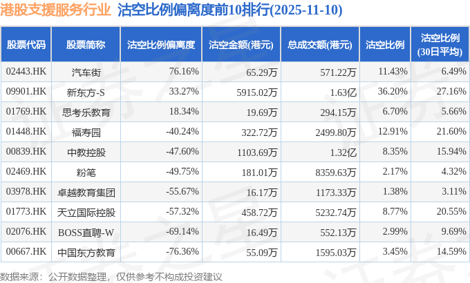 从沽空比例偏离度来看,汽车街、新东方-S、思考乐教育沽空比例偏离度位居行业前三,分别为76.16%、33.27%、18.34%。