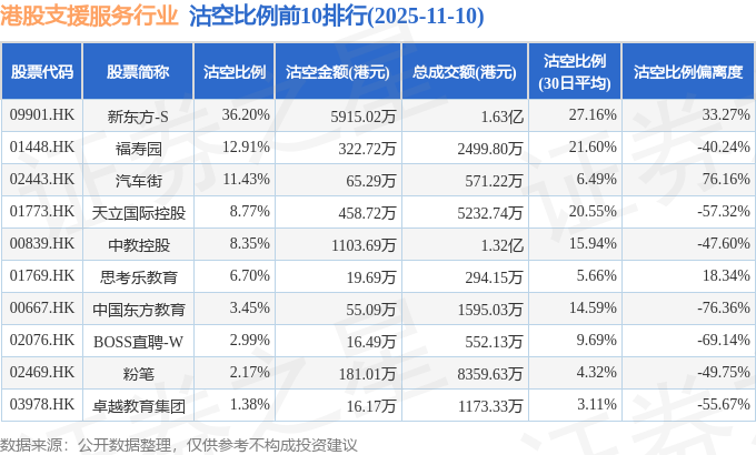 从沽空比例来看,新东方-S、福寿园、汽车街沽空比例位居行业前三,分别为36.2%、12.91%、11.43%。