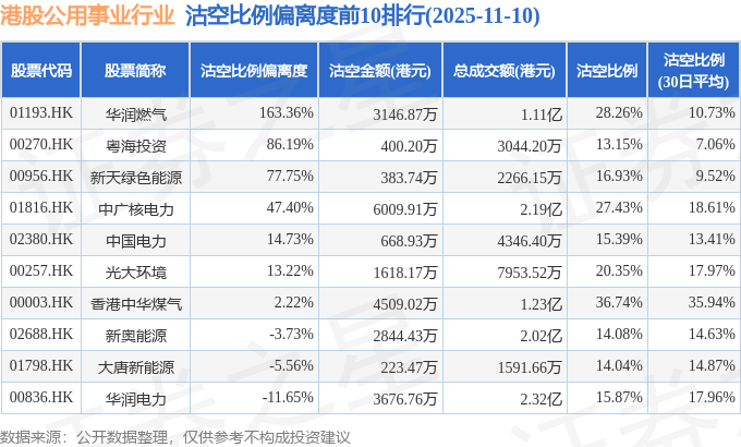 从沽空比例偏离度来看,华润燃气、粤海投资、新天绿色能源沽空比例偏离度位居行业前三,分别为163.36%、86.19%、77.75%。