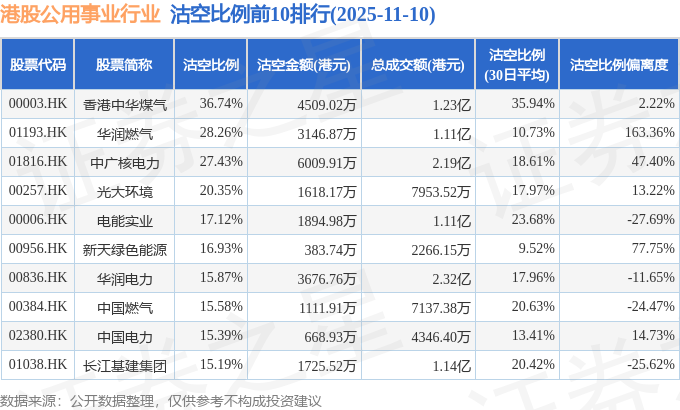 从沽空比例来看,香港中华煤气、华润燃气、中广核电力沽空比例位居行业前三,分别为36.74%、28.26%、27.43%。