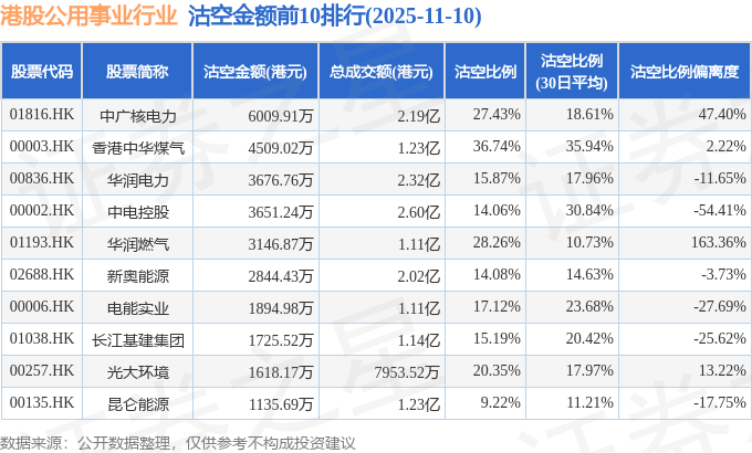从沽空金额来看,中广核电力、香港中华煤气、华润电力沽空金额位居行业前三,分别为6009.91万港元、4509.02万港元、3676.76万港元。