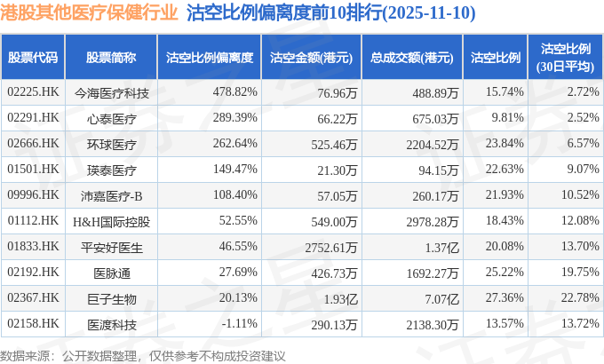 从沽空比例偏离度来看,今海医疗科技、心泰医疗、环球医疗沽空比例偏离度位居行业前三,分别为478.82%、289.39%、262.64%。