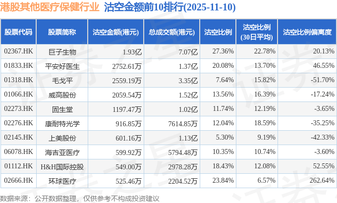 从沽空金额来看,巨子生物、平安好医生、毛戈平沽空金额位居行业前三,分别为1.93亿港元、2752.61万港元、2559.19万港元。