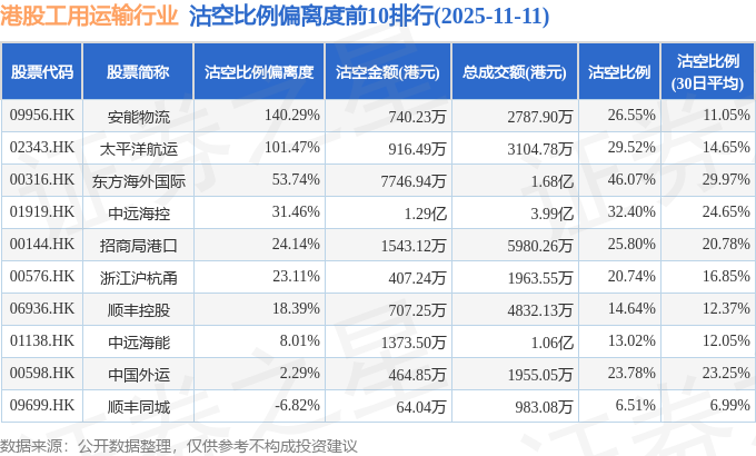 从沽空比例偏离度来看,安能物流、太平洋航运、东方海外国际沽空比例偏离度位居行业前三,分别为140.29%、101.47%、53.74%。