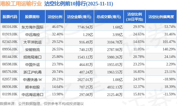 从沽空金额来看,中远海控、东方海外国际、中通快递-W沽空金额位居行业前三,分别为1.29亿港元、7746.94万港元、2027.01万港元。