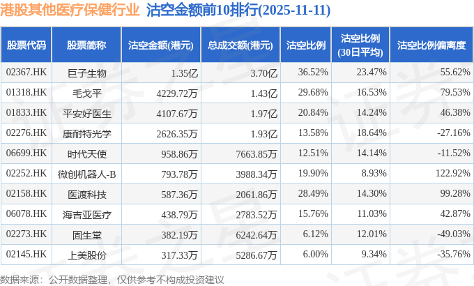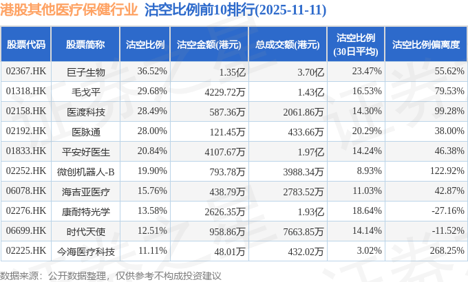 从沽空比例偏离度来看,今海医疗科技、美中嘉和、微创机器人-B沽空比例偏离度位居行业前三,分别为268.25%、139.71%、122.92%。