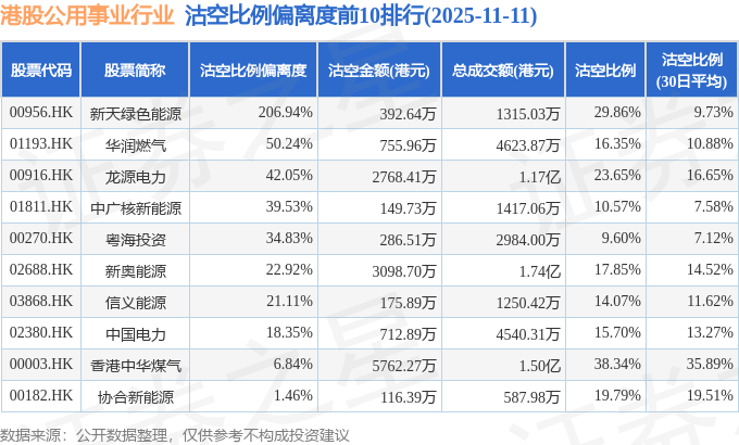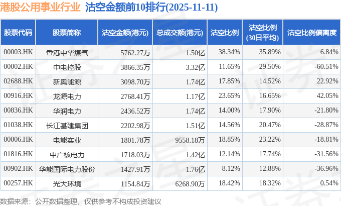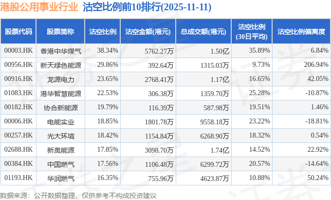 从沽空比例来看,香港中华煤气、新天绿色能源、龙源电力沽空比例位居行业前三,分别为38.34%、29.86%、23.65%。