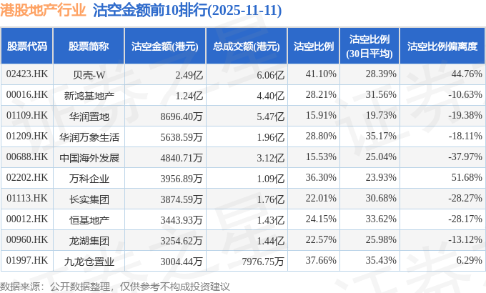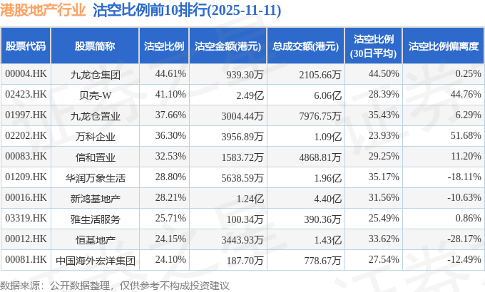 从沽空比例来看,九龙仓集团、贝壳-W、九龙仓置业沽空比例位居行业前三,分别为44.61%、41.1%、37.66%。