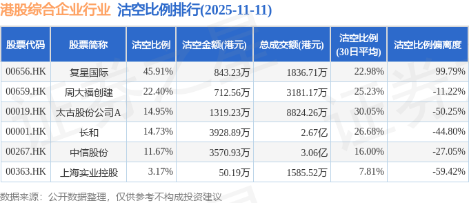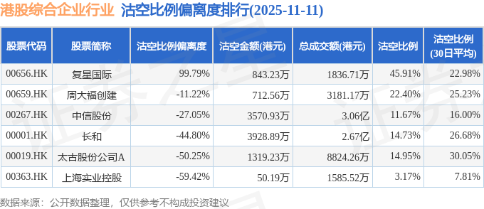 从沽空比例偏离度来看,复星国际、周大福创建、中信股份沽空比例偏离度位居行业前三,分别为99.79%、-11.22%、-27.05%。