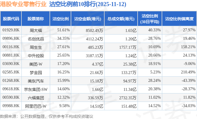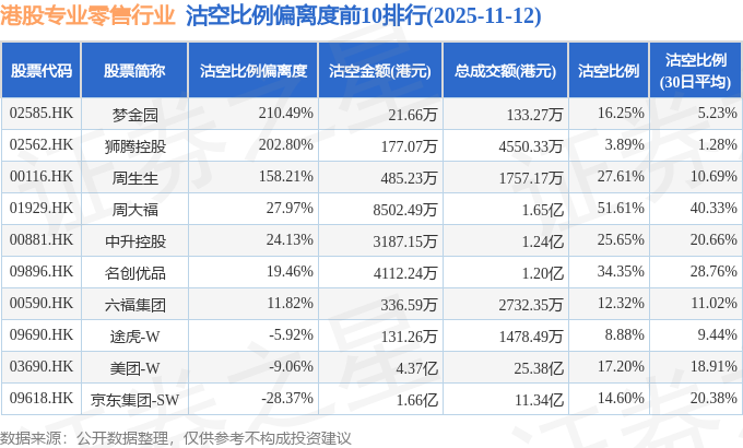 从沽空比例偏离度来看,梦金园、狮腾控股、周生生沽空比例偏离度位居行业前三,分别为210.49%、202.8%、158.21%。