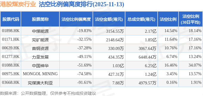 从沽空比例偏离度来看,中煤能源、兖矿能源、首钢资源沽空比例偏离度位居行业前三,分别为-19.83%、-32.15%、-37.28%。