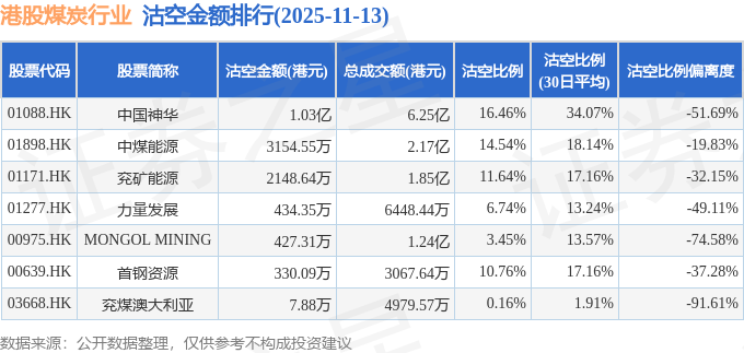 从沽空金额来看,中国神华、中煤能源、兖矿能源沽空金额位居行业前三,分别为1.03亿港元、3154.55万港元、2148.64万港元。