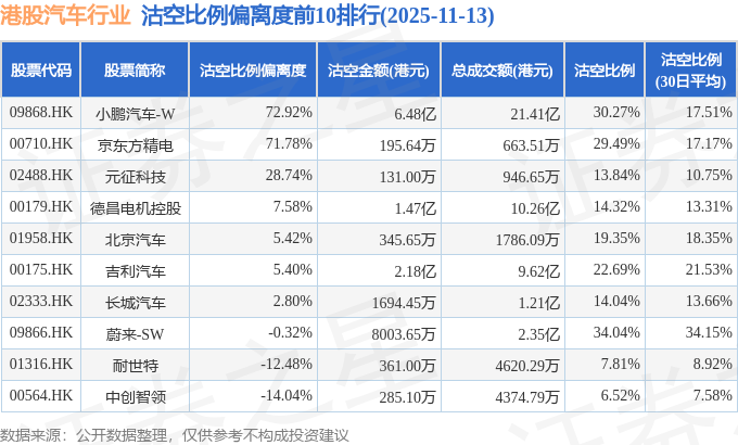 从沽空比例偏离度来看,小鹏汽车-W、京东方精电、元征科技沽空比例偏离度位居行业前三,分别为72.92%、71.78%、28.74%。