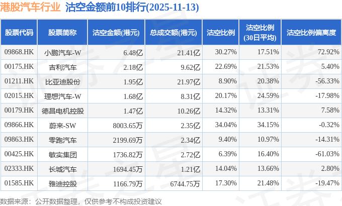 从沽空金额来看,小鹏汽车-W、吉利汽车、比亚迪股份沽空金额位居行业前三,分别为6.48亿港元、2.18亿港元、1.95亿港元。