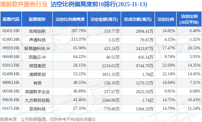 从沽空比例偏离度来看,佑驾创新、声通科技、联易融科技-W沽空比例偏离度位居行业前三,分别为287.79%、213.37%、65.9%。