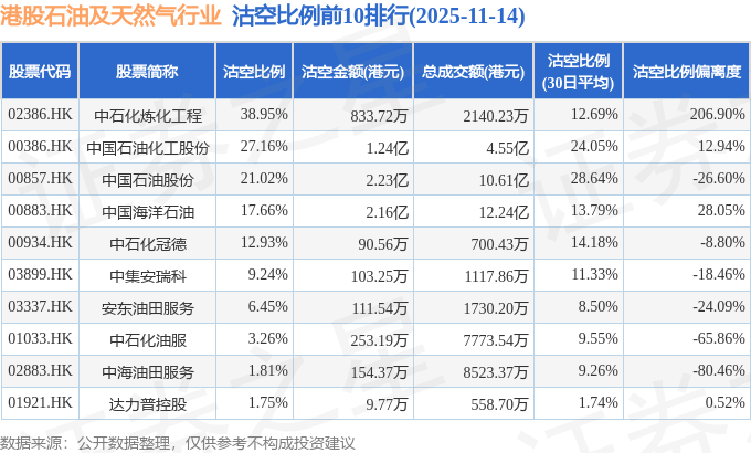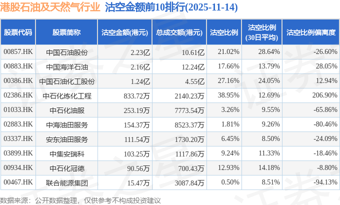 从沽空金额来看,中国石油股份、中国海洋石油、中国石油化工股份沽空金额位居行业前三,分别为2.23亿港元、2.16亿港元、1.24亿港元。