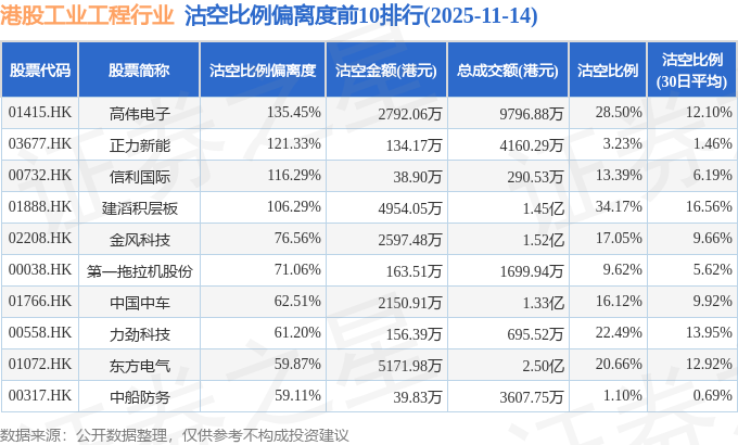 从沽空比例偏离度来看,高伟电子、正力新能、信利国际沽空比例偏离度位居行业前三,分别为135.45%、121.33%、116.29%。
