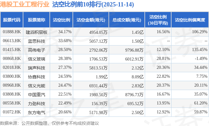 证券之星消息,11月14日港交所披露数据显示,当日港股工业工程行业的219只个股中有56只被沽空,总沽空股数为2.16亿股,总沽空金额为11.29亿元(港元),而当日工业工程行业的总成交金额为98.76亿元(港元),沽空比例为11.43%。当日工业工程行业总体跌1.34%。