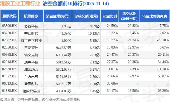 从沽空金额来看,协鑫科技、宁德时代、舜宇光学科技沽空金额位居行业前三,分别为1.99亿港元、1.39亿港元、1.02亿港元。