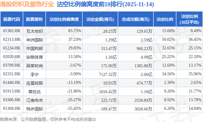 从沽空比例偏离度来看,互太纺织、申洲国际、中国利郎沽空比例偏离度位居行业前三,分别为83.73%、37.23%、29.83%。