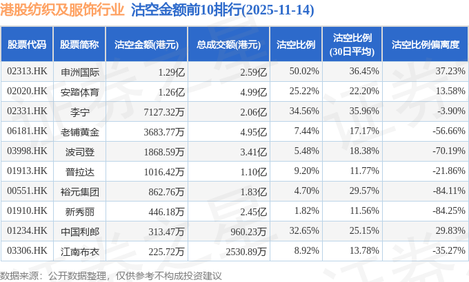 从沽空比例来看,申洲国际、李宁、中国利郎沽空比例位居行业前三,分别为50.02%、34.56%、32.65%。