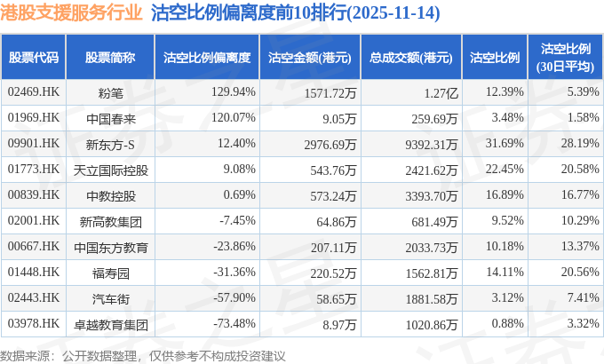 从沽空金额来看,新东方-S、粉笔、中教控股沽空金额位居行业前三,分别为2976.69万港元、1571.72万港元、573.24万港元。