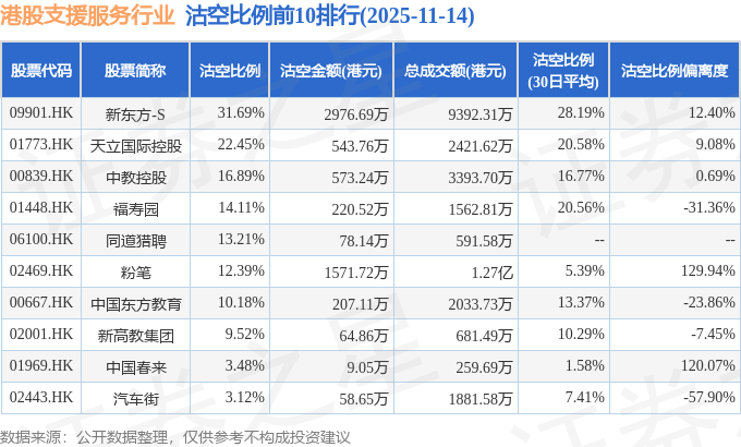 从沽空比例来看,新东方-S、天立国际控股、中教控股沽空比例位居行业前三,分别为31.69%、22.45%、16.89%。