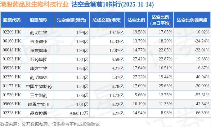 从沽空金额来看,药明生物、百济神州、京东健康沽空金额位居行业前三,分别为1.99亿港元、1.98亿港元、1.9亿港元。