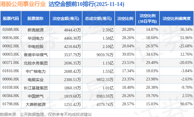 从沽空金额来看,新奥能源、华润电力、中电控股沽空金额位居行业前三,分别为4844.43万港元、4466.3万港元、4210.84万港元。