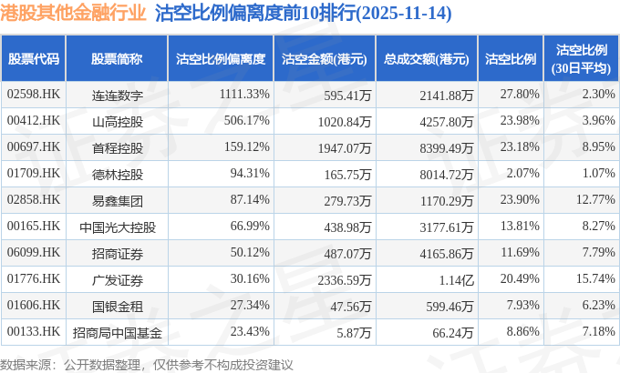 从沽空比例偏离度来看,连连数字、山高控股、首程控股沽空比例偏离度位居行业前三,分别为1111.33%、506.17%、159.12%。