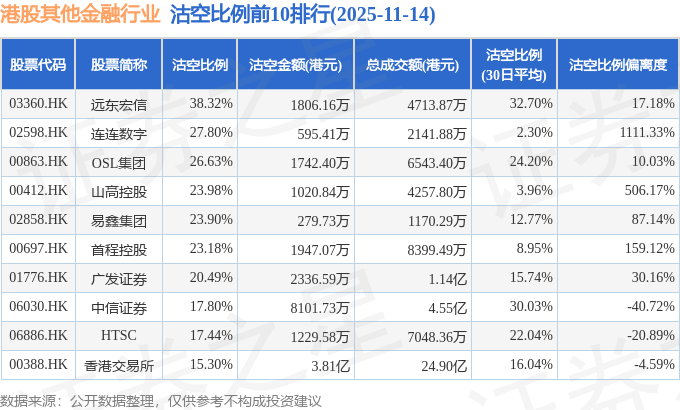 由于港股人民币柜台交易股票成交金额较小,沽空比例普遍偏高,为了避免干扰,已将人民币柜台交易股票从排行表格中剔除。