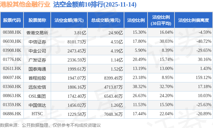 从沽空金额来看,香港交易所、中信证券、中金公司沽空金额位居行业前三,分别为3.81亿港元、8101.73万港元、2473.45万港元。