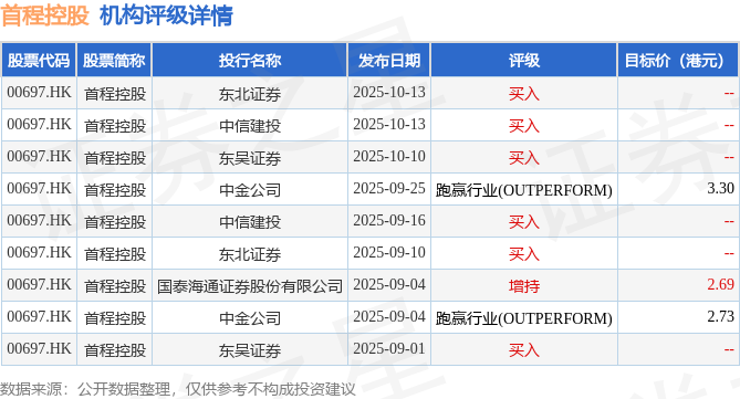 截至2025年11月14日收盘,首程控股(00697.HK)报收于2.12港元,下跌3.2%,成交量3927.64万股,成交额8399.49万港元。投行对该股的评级以买入为主,近90天内共有6家投行给出买入评级,近90天的目标均价为2.91港元。东北证券最新一份研报给予首程控股买入评级。