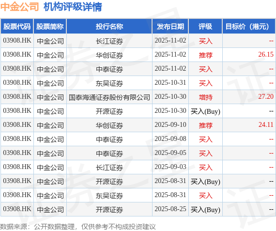 截至2025年11月14日收盘,中金公司(03908.HK)报收于19.62港元,下跌3.63%,成交量2119.12万股,成交额4.19亿港元。投行对该股的评级以买入为主,近90天内共有7家投行给出买入评级,近90天的目标均价为25.82港元。长江证券最新一份研报给予中金公司买入评级。