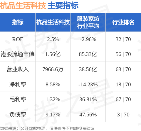 杭品生活科技港股市值1.56亿港元,在服装家纺行业中排名第56。主要指标见下表: