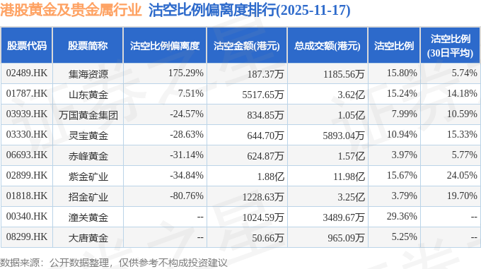 从沽空比例偏离度来看,集海资源、山东黄金、万国黄金集团沽空比例偏离度位居行业前三,分别为175.29%、7.51%、-24.57%。