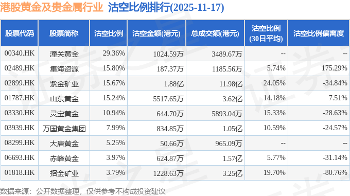 从沽空比例来看,潼关黄金、集海资源、紫金矿业沽空比例位居行业前三,分别为29.36%、15.8%、15.67%。