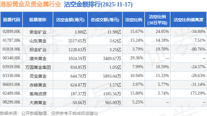 从沽空金额来看,紫金矿业、山东黄金、招金矿业沽空金额位居行业前三,分别为1.88亿港元、5517.65万港元、1228.63万港元。