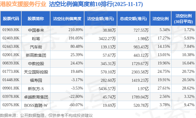 从沽空比例偏离度来看,中国春来、粉笔、汽车街沽空比例偏离度位居行业前三,分别为210.89%、191.05%、80.48%。