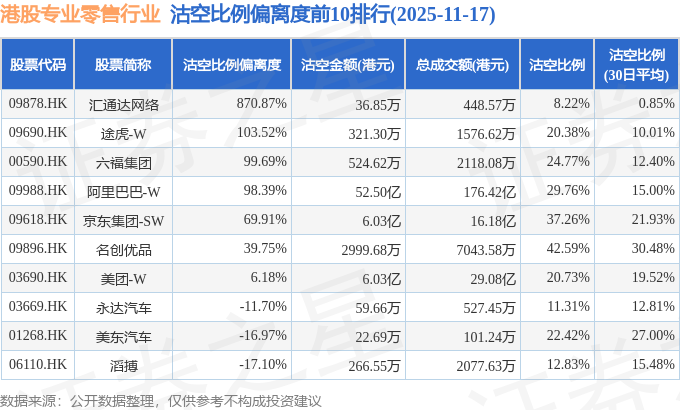 从沽空比例偏离度来看,汇通达网络、途虎-W、六福集团沽空比例偏离度位居行业前三,分别为870.87%、103.52%、99.69%。