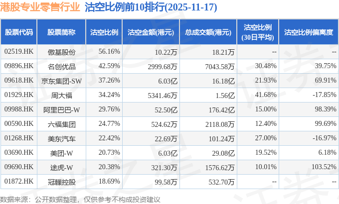 从沽空比例来看,傲基股份、名创优品、京东集团-SW沽空比例位居行业前三,分别为56.16%、42.59%、37.26%。