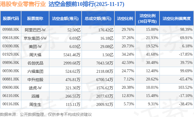 由于港股人民币柜台交易股票成交金额较小,沽空比例普遍偏高,为了避免干扰,已将人民币柜台交易股票从排行表格中剔除。