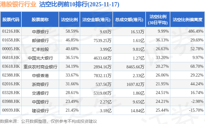 从沽空比例来看,中原银行、邮储银行、汇丰控股沽空比例位居行业前三,分别为58.59%、46.85%、40.68%。